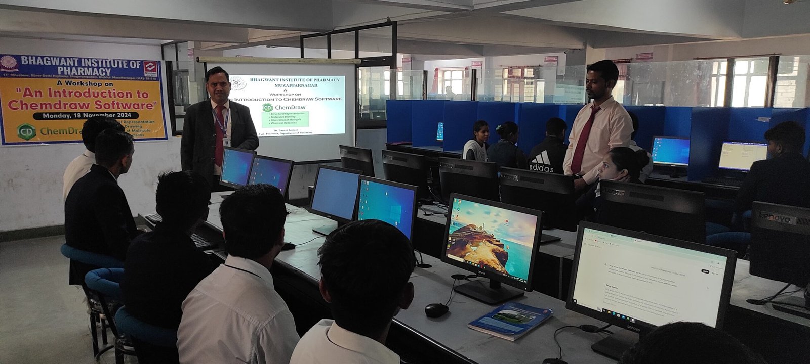 Bhagwant Institute of Pharmacy conducted a practical workshop on “An Introduction to ChemDraw Software” on 18th November 2024. The session focused on giving students a clear understanding of ChemDraw, an essential tool used in chemical structure drawing and pharmaceutical research.